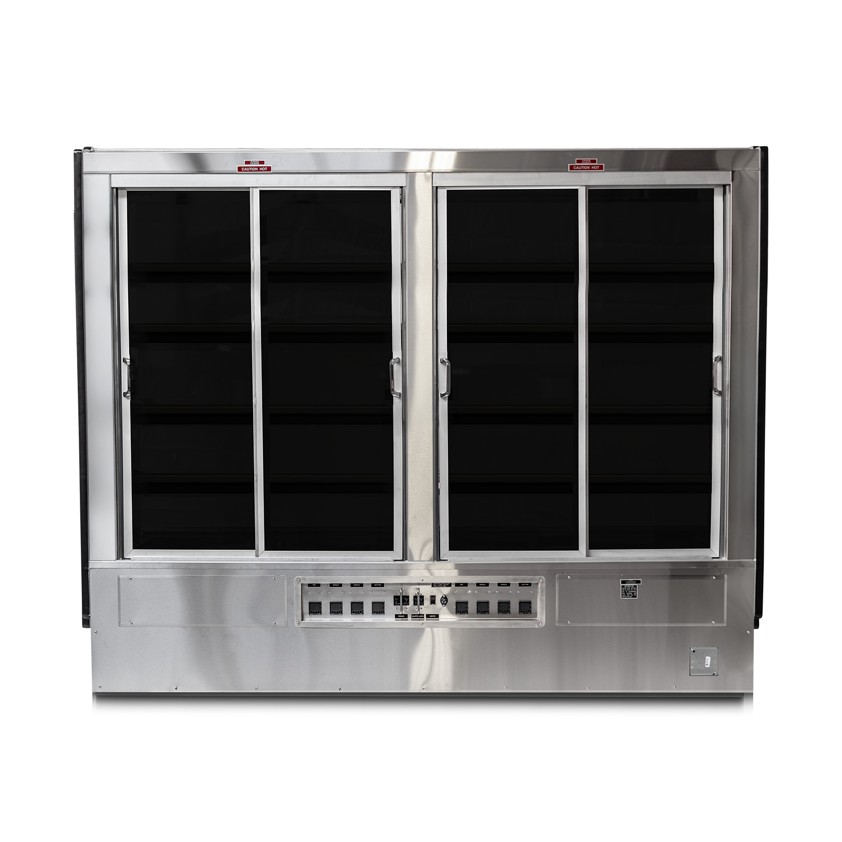 Our Multi-Deck heated units function as self-serve display cabinets designed for packaged hot food, rotisserie chicken, and more. Featuring 8 shelves, transparent design, and advanced heating technology, this unit is optimal for large food capacity.